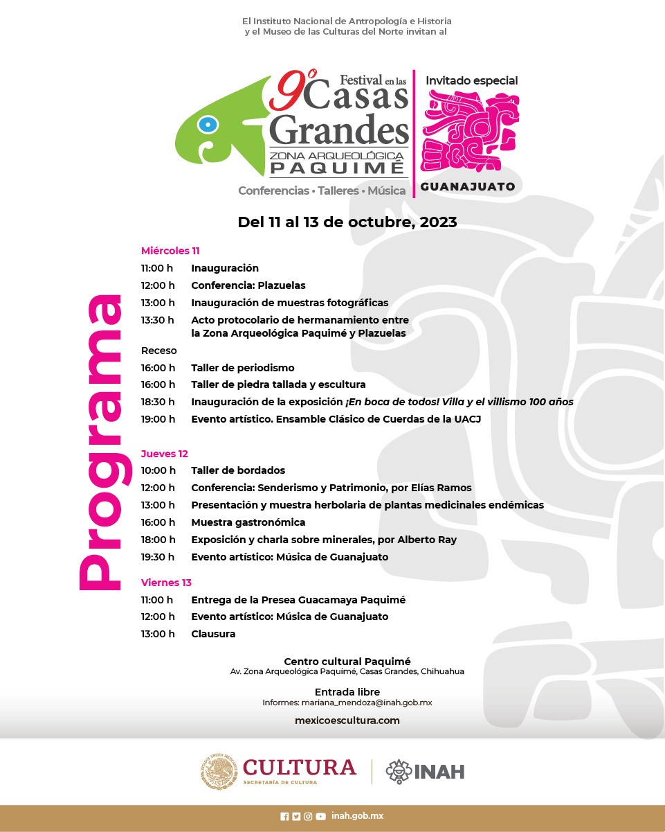 El Instituto Nacional de Antropología e Historia (INAH) en el estado de Chihuahua a través del Centro Cultural Paquimé y en coordinación con el Consejo Regional de Cultura del Norte, invitan al 9no Festival en las Casas Grandes con el objetivo de promover y difundir el patrimonio cultural de la cultura Casas Grandes, además de sede de encuentro con otras culturas originarias de México, en este caso con las que habitan el estado de Guanajuato.