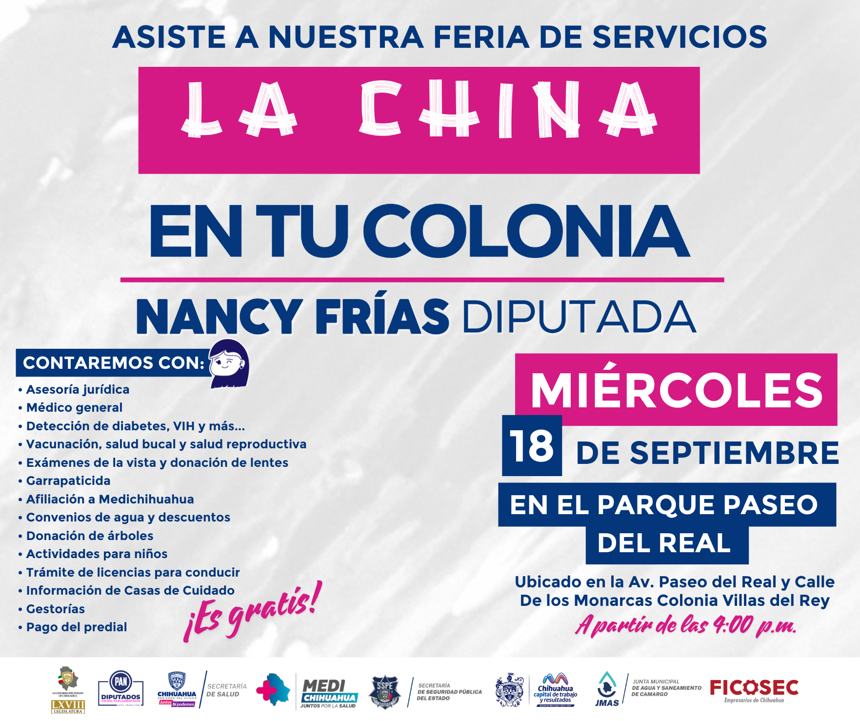 Chihuahua, Chih.- La diputada por el Partido Acción Nacional (PAN), Nancy “La China” Frías, representante del Distrito 12, anunció la primera fecha de la feria de servicios comunitarios “La China en tu Colonia”. Esta se llevará a cabo el miércoles 18 de septiembre en el parque Paseo Del Real, ubicado en la intersección de la avenida Paseo Del Real y la calle De los Monarcas en la colonia Villas del Rey, a partir de las 4:00 p.m.