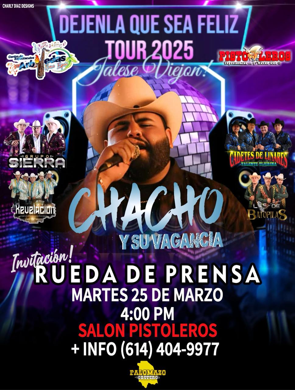 El viernes 4 de abril de 2025, el Salón Pistoleros en Chihuahua se vestirá de gala para recibir a Chacho y su Bagancia, quienes forman parte de la gira “Déjenla que sea feliz”. Este evento promete una noche llena de música y baile para todos los asistentes
