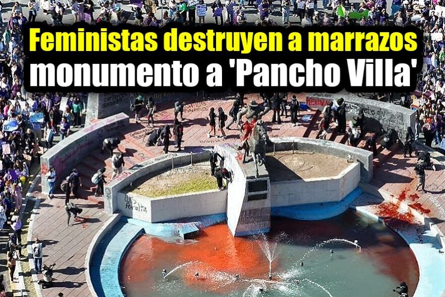 La manifestación comenzó a las cuatro de la tarde en la glorieta de “Pancho” Villa en la División del Norte y Universidad, desde ahí comenzaron los destrozos; martillazos a la cerámica, pintura al monumento, pintaron el agua de la fuente y grafitearon la glorieta.