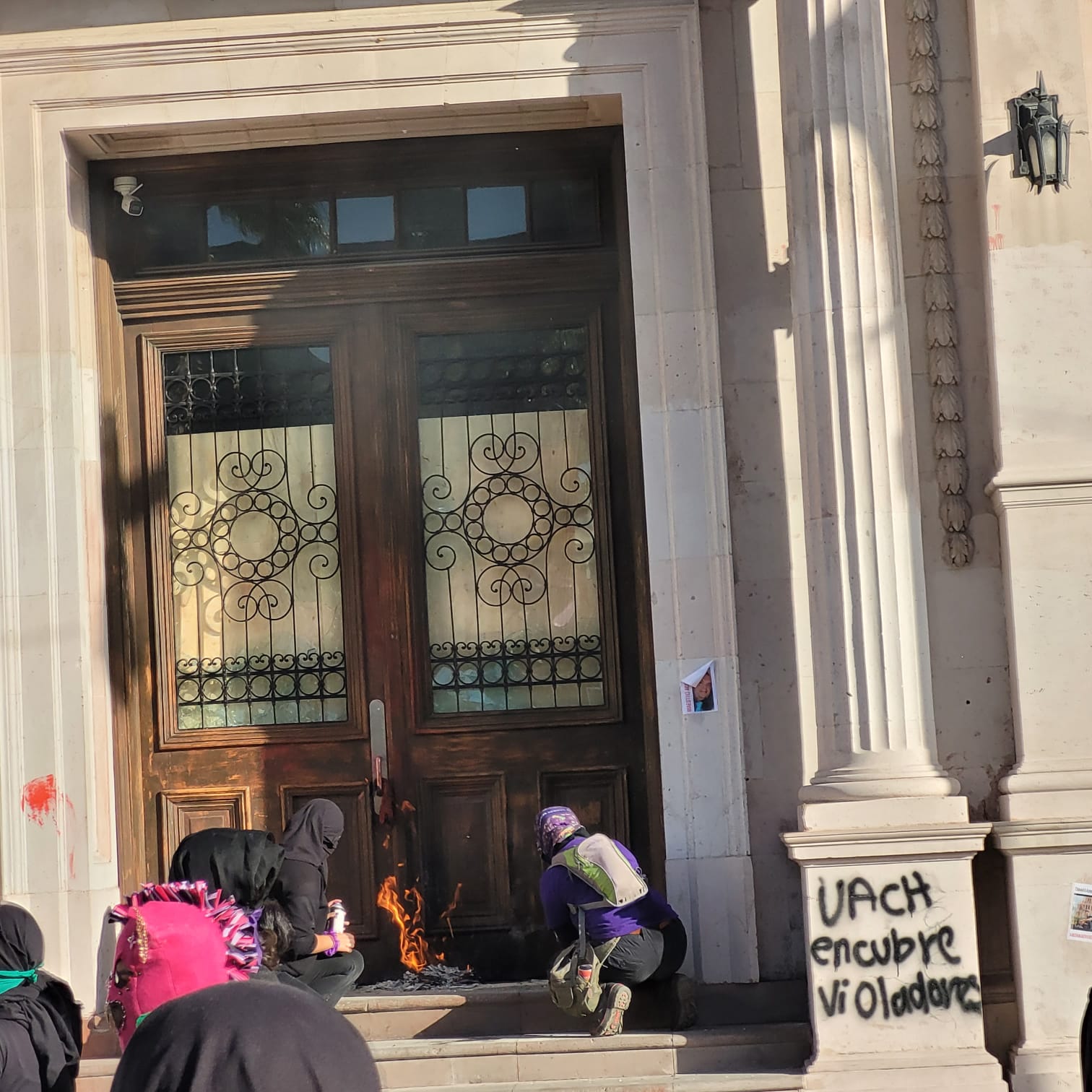 Al no poder derribar la barrera, las manifestantes lapidaron ventanas de Rectoría, grafitearon y hasta trataron de quemar la puerta,