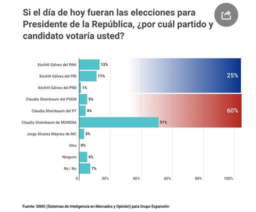 SIMO para Grupo Expansión – Redacción. La candidata de la coalición “Sigamos Haciendo Historia” (Morena, PT y Partido Verde), Claudia Sheinbaum, llega a la mitad de las intercampañas y a 15 días de arrancar la batalla electoral formal con una amplia ventaja de 35 puntos sobre Xóchitl Gálvez, la abanderada de la coalición “Fuerza y Corazón por México” (PAN, PRI y PRD), de acuerdo con la primera encuesta elaborada por SIMO para Grupo Expansión.