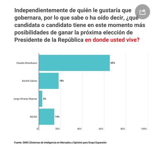 En esta encuesta, también se preguntó “quién considera que tiene mayores posibilidades de ganar la elección presidencial”; el 65% considera que Claudia Sheinbaum es la candidata favorita en estos momentos mientras que 18% mencionó que es Xóchitl Gálvez. De lo anterior se desprende que hay un porcentaje importante de personas que prefieren a Gálvez, pero reconocen que se encuentra rezagada en la contienda presidencial.
