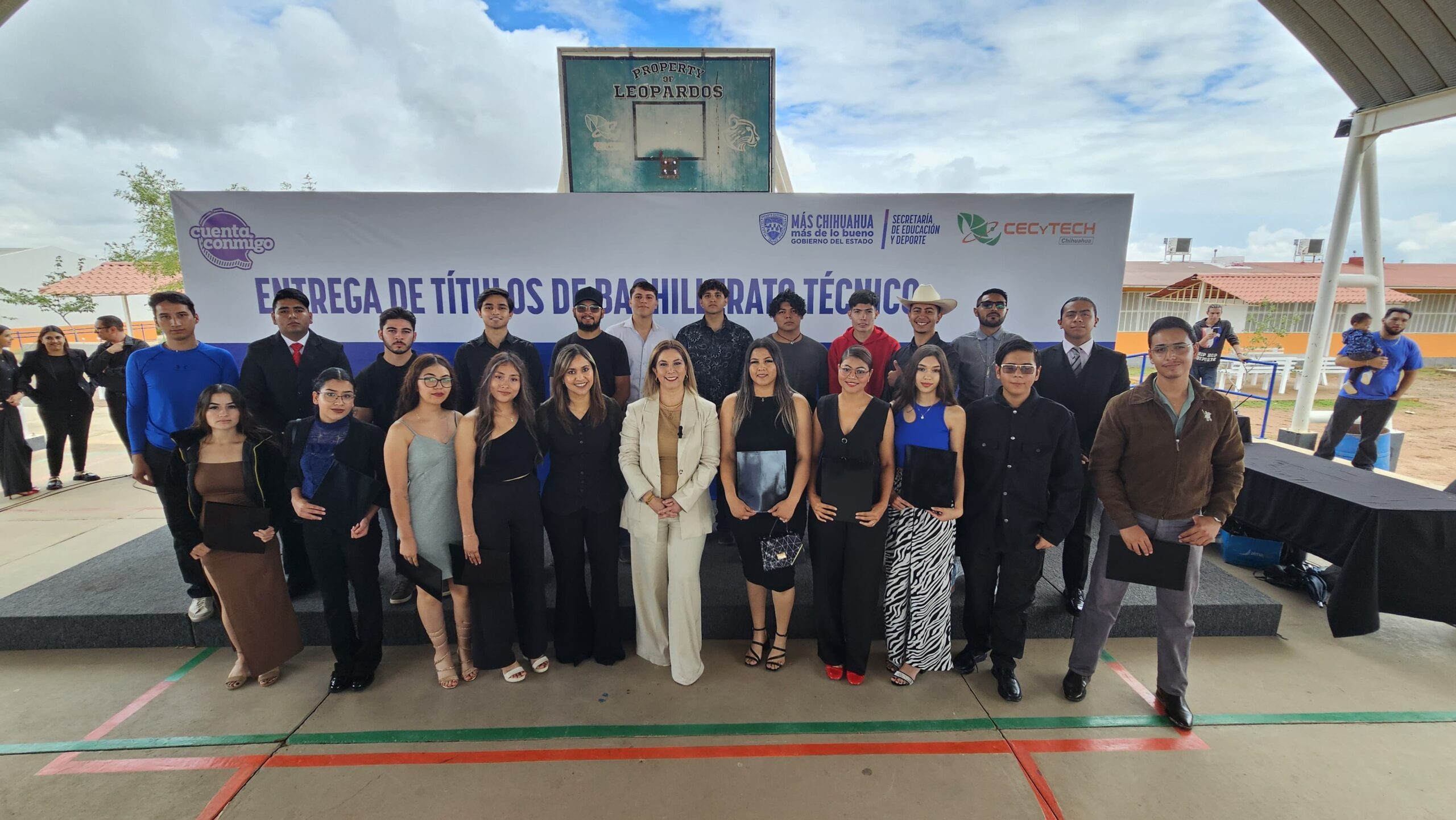 Durante la ceremonia se contó con la presencia de Martha del Carmen Sosa González, directora académica del CECyTECH; Ulises García Soto, titular de la Oficina de Enlace Educativo de la SEP en Chihuahua; Gloria Jannette Muñiz Villalba, jefa del Departamento de Enlace Educativo de la SEyD; y Sherlyn Terrazas Gándara, egresada de la generación 2020-2023.