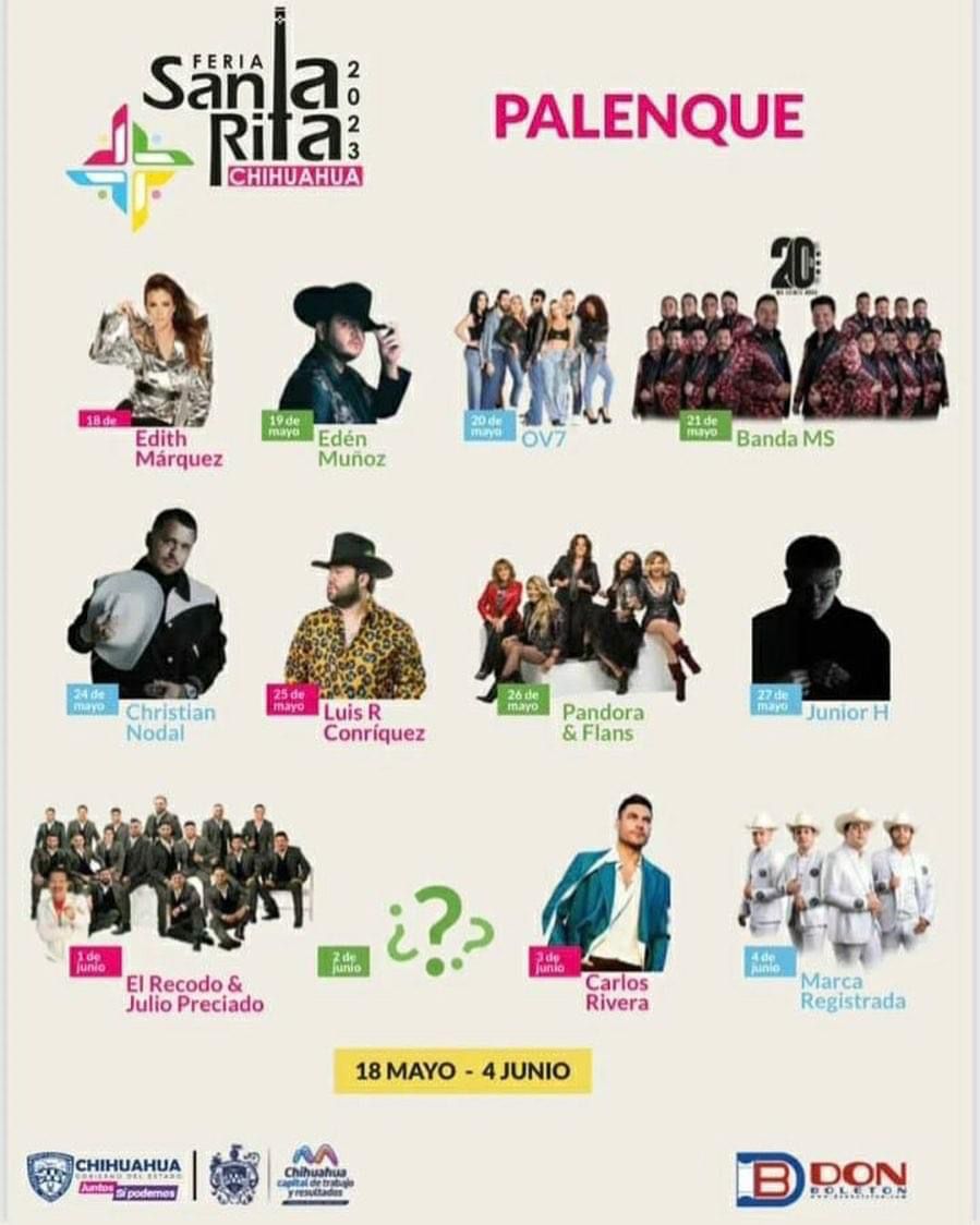 Edith Márquez, Edén Muñoz, OV7, Banda MS, Christian Nodal, Luis R. Conríquez, Pandora y Flans, Junior H, El Recodo & Julio Preciado, Carlos Rivera, Marca Registrada y un invitado sorpresa se presentarán en las noches de Palenque con lo mejor de sus shows para el público chihuahuense.