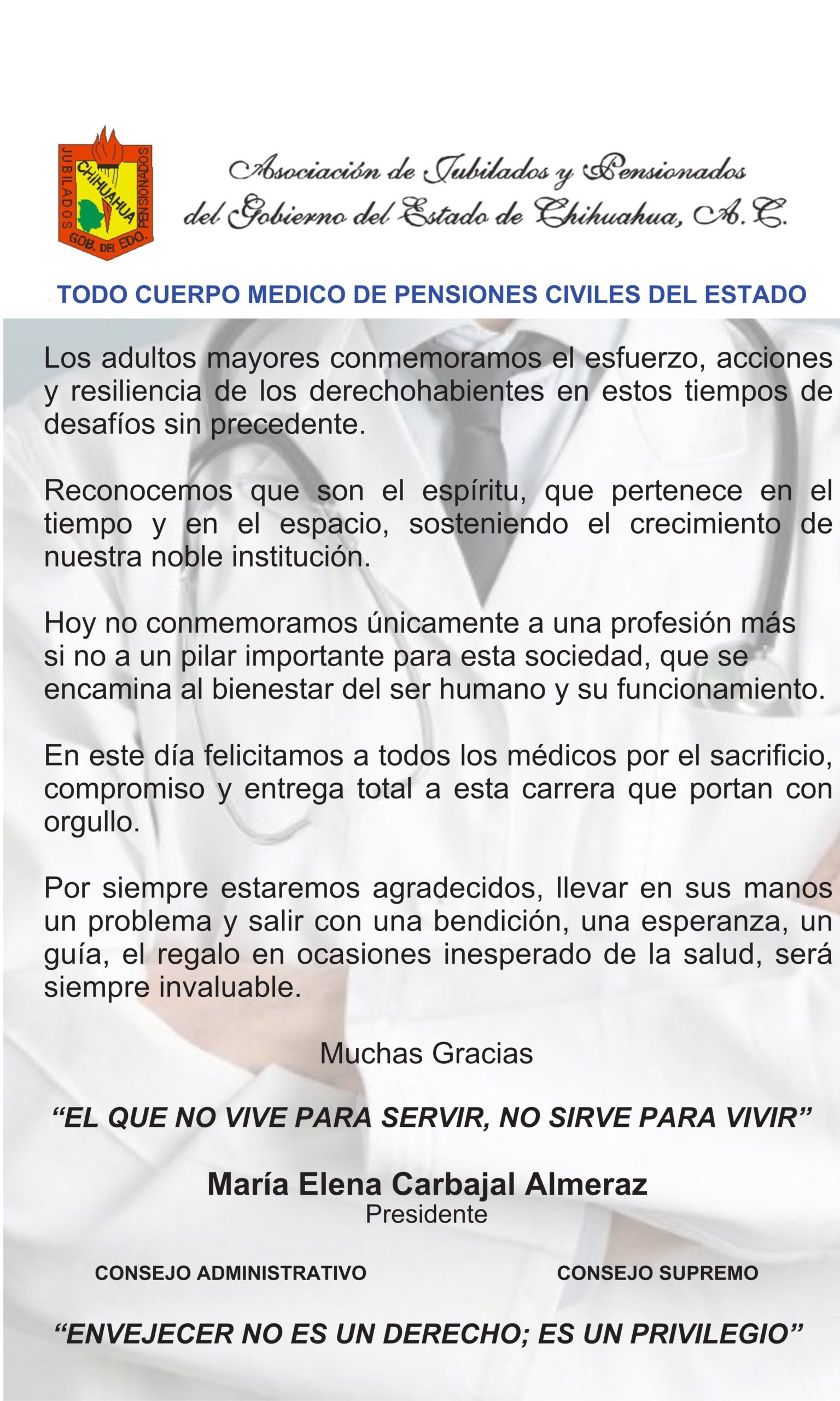 Chihuahua, Chih. – Con motivo del Día del Médico, que se conmemora cada 23 de octubre, la Asociación de Jubilados y Pensionados del Gobierno del Estado de Chihuahua A.C. organizó un evento especial para rendir homenaje a los hombres y mujeres que dedican su vida a la medicina, tanto en el ámbito público como en el privado.