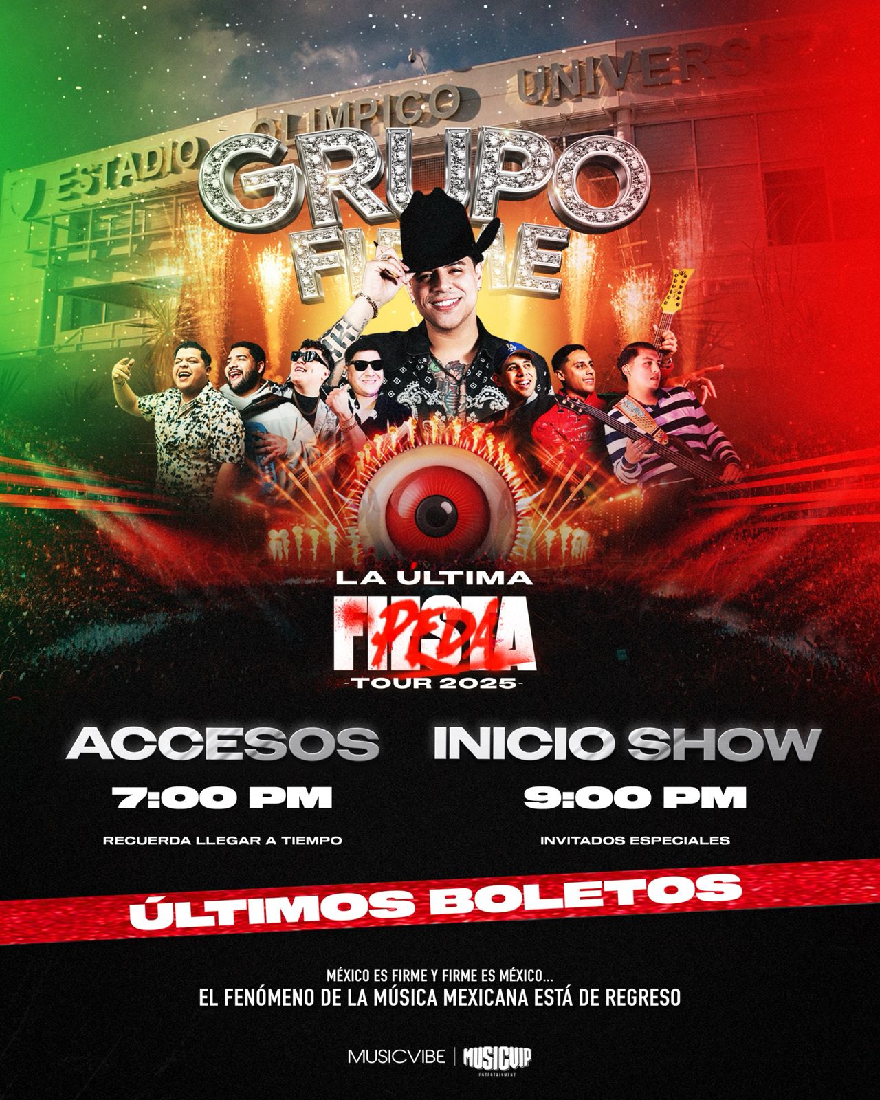 Grupo Firme, la banda que ha revolucionado la música regional mexicana, se presentará en Chihuahua este sábado 26 de abril de 2025, en el Estadio Olímpico Universitario, como parte de su exitosa gira La Última Peda Tour. Este evento promete ser una de las celebraciones más memorables del año, con un espectáculo lleno de energía, música en vivo y una producción de primer nivel