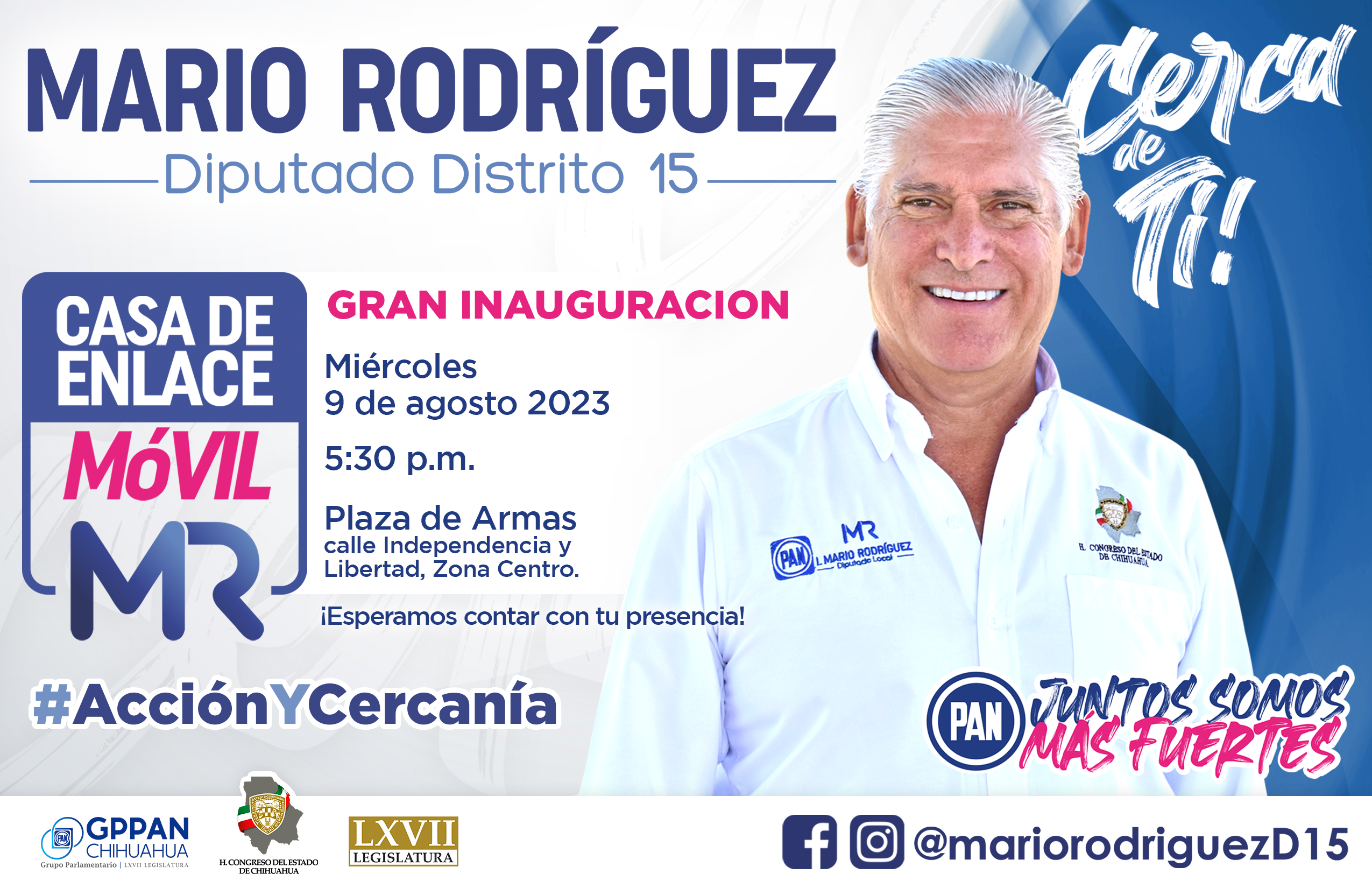Chihuahua, Chih.- El diputado Mario Rodríguez del Partido Acción Nacional (PAN), inaugurará su Casa de Enlace Móvil este miércoles 9 de agosto en la Plaza de Armas, en Calle Independencia y Libertad, la cita es a las 5:30 de la tarde, y está invitada la ciudadanía en general.