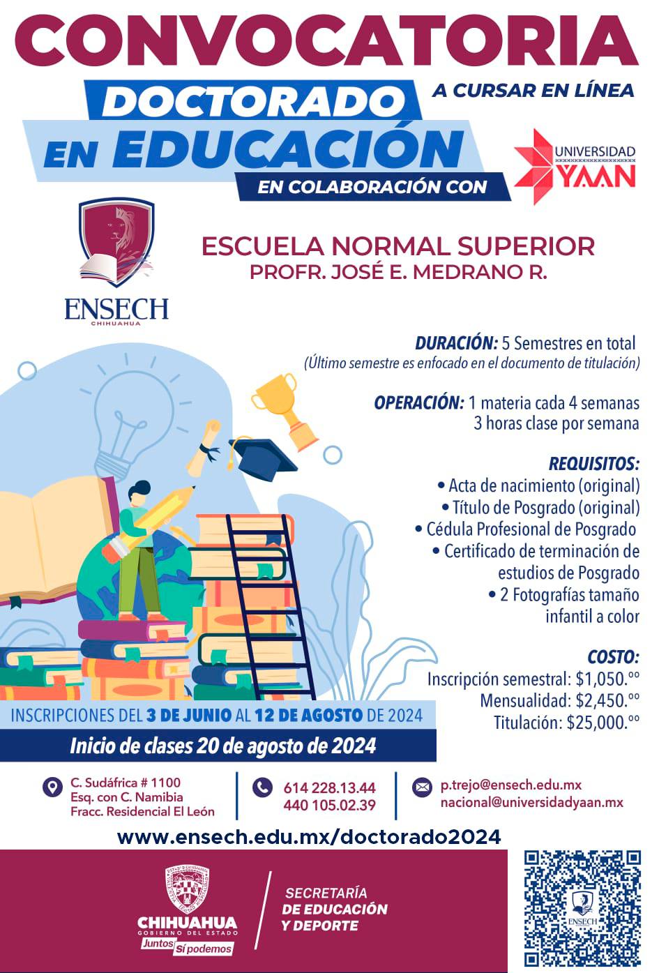 El proceso de inscripción se mantiene abierto hasta el 12 de agosto y para mayor información sobre los requisitos de ingreso, las personas interesadas pueden ingresar a la página Web www.ensech.edu.mx/doctorado2024 o a los números telefónicos 6142281344 o 4401050239.