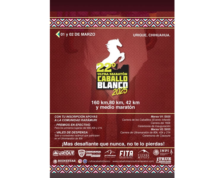 Chihuahua, México.- La Secretaría de Turismo de Chihuahua, en colaboración con el Municipio de Urique, invita a corredores nacionales e internacionales a participar en la 22ª edición del Ultra Maratón Caballo Blanco, que se celebrará los días 1 y 2 de marzo en el municipio de Urique.