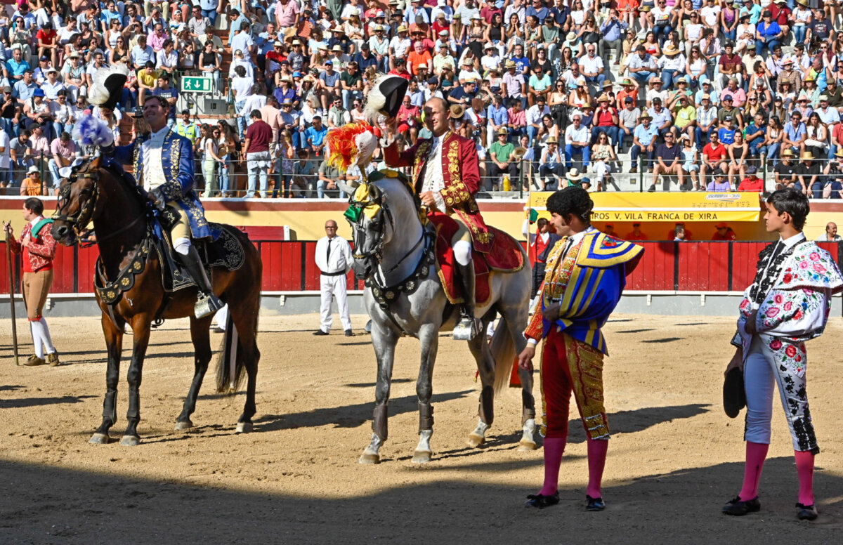 Vila Franca de Xira (Portugal), domingo 2 de julio de 2023. Toros de Alves Inácio y Garcigrande. Manuel Telles Bastos, que sustituyó a Joao Salgueiro, vuelta y vuelta; Joao Ribeiro Telles, vuelta y vuelta; Morante de la Puebla, vuelta y vuelta; y el novillero Tomás Bastos, vuelta. Actuaron los forcados de Vila Franca.