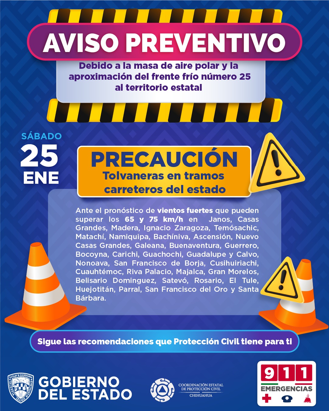 Las ráfagas de viento pueden ocasionar tolvaneras en los tramos carreteros de Juárez -Janos, Janos-Flores Magón, Chihuahua-La Junta, Chihuahua -Ahumada y Jiménez-Parral.