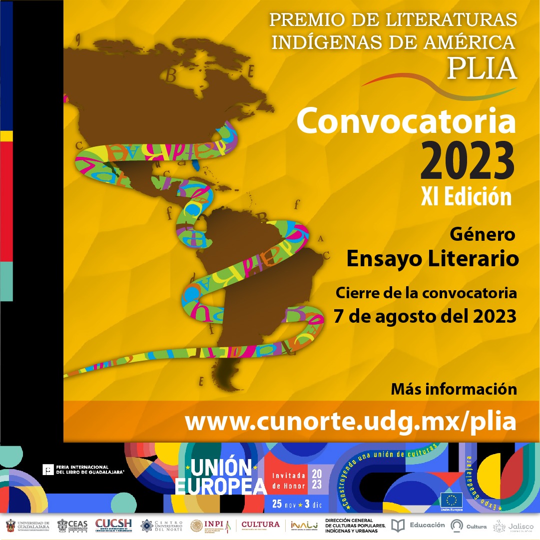 Guadalajara, Jal, a 26 de abril de 2023.- Con la finalidad de estimular y reconocer la creación literaria de las personas escritoras en lenguas indígenas, el Comité Interinstitucional del Premio de Literaturas Indígenas de América (PLIA), anunció hoy el lanzamiento de la convocatoria de la undécima edición de este galardón literario, que se otorgará por obra inédita en el género de ensayo literario.