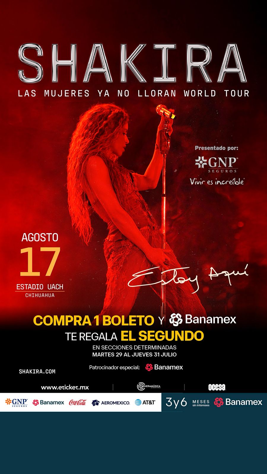 La superestrella colombiana Shakira se presentará en Chihuahua como parte de su esperada gira, y una promoción imperdible está causando furor entre sus fans: compra un boleto con Banamex y recibe el segundo completamente gratis. 😱